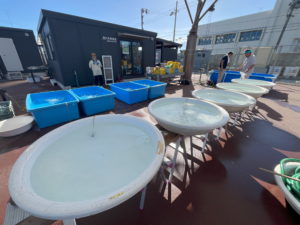 魚溜まりや審査盥を並べて水を張り